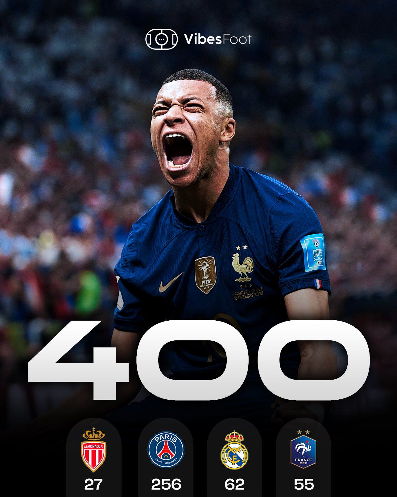 6686体育官网11月14日讯 世欧预倒数第二轮,姆巴佩梅开二度,法国4-0击败乌克兰,获得世杯赛入场券。而姆巴佩也达成了职业生涯400球里程碑。