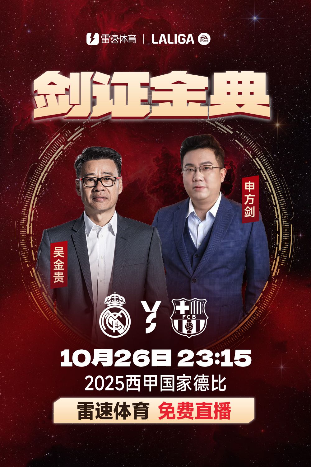 北京时间10月26日23:15,西甲第10轮,皇家马德里将在主队场迎战巴塞罗那,这将是本赛季首次西班牙国家德比。6686体育官网将免费视频直播这场焦点对决,并非常荣幸地邀请到了两位特殊嘉宾担任本场竞赛的解说,分别为知名教练员吴金贵以及著名解说员申方剑。