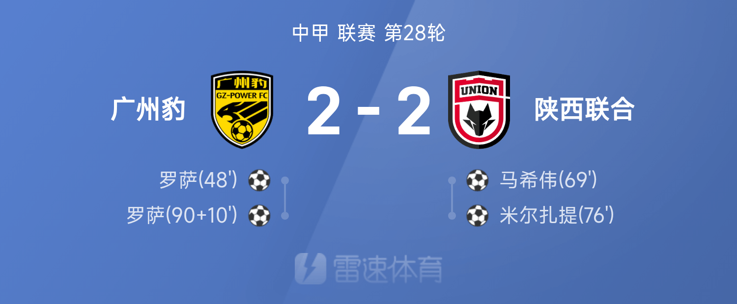 中甲战报:罗萨梅开二度+绝平,广州豹2-2战平陕西联合
