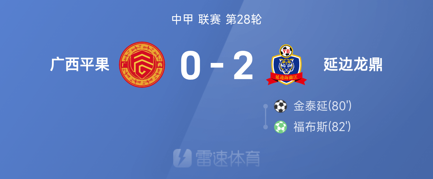6686体育官网10月26日讯 25赛季中甲联赛事第28轮,延边龙鼎2-0战胜广西平果。全场竞赛,福布斯、金泰延破门建功。