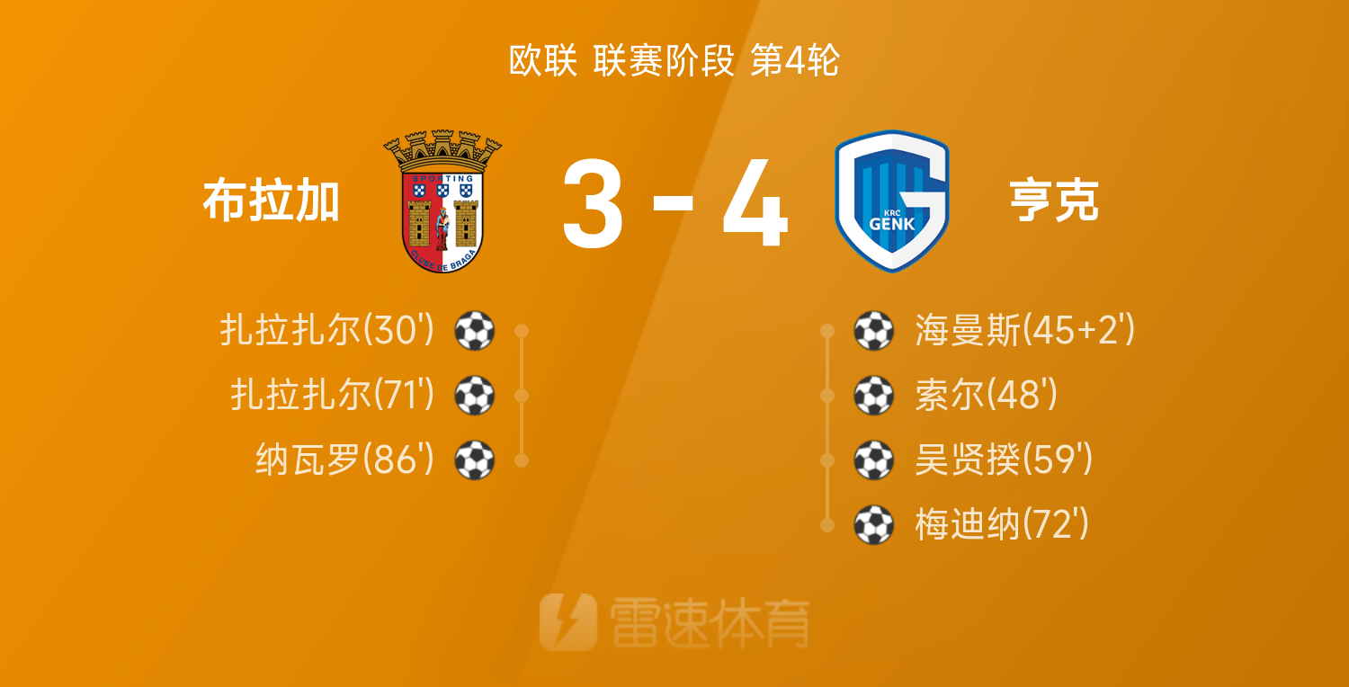 欧联战报:海曼斯1射1传,扎拉扎尔双响,亨克4-3布拉加