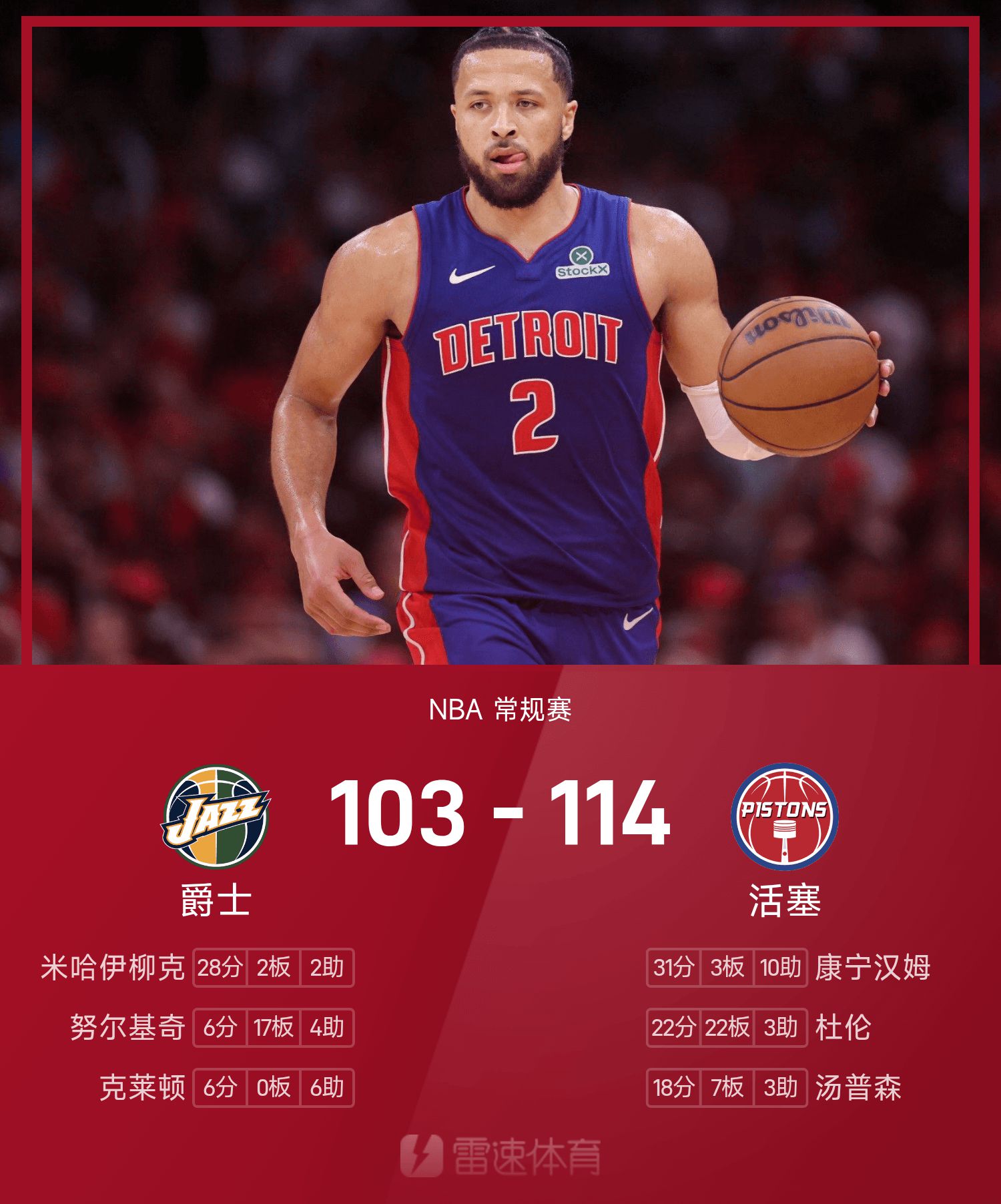 6686体育官网11月06日讯 25/26赛季NBA 常规赛,活塞对阵爵士。双方全场战罢,活塞114-103战胜爵士。康宁汉姆砍下全场最高的31分3板10助,率领活塞胜利取胜。
